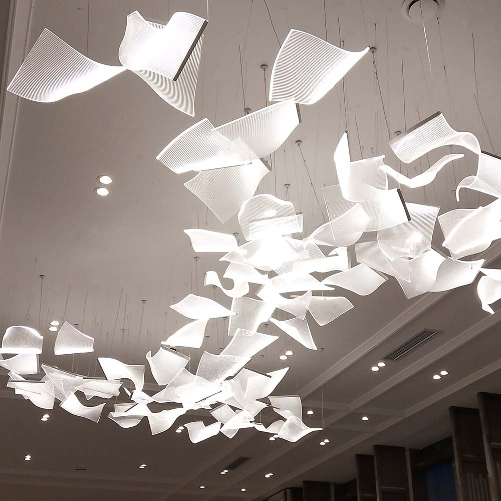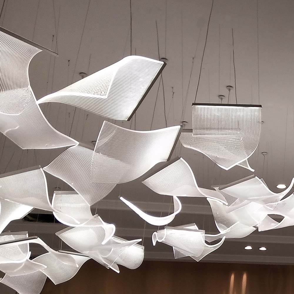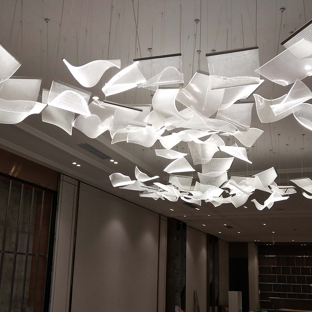 Designed for hotel lobbies, premium clubs, and commercial spaces, this custom modern acrylic hanging chandelier is crafted from high-quality acrylic panels with varying curved profiles, layered to create a striking three-dimensional silhouette. Each acrylic piece undergoes precise laser cutting and thermoforming to achieve smooth, natural curves, allowing light to pass through and refract into soft, layered illumination that enhances the ambiance with elegance and dynamism. The minimalist yet sophisticated design, paired with optional matte metal frames or hidden LED lighting, embodies contemporary aesthetics while seamlessly blending into upscale interiors. Flexible installation options and customizable dimensions, colors, and lighting modes make it ideal for diverse spatial requirements, elevating any environment with its artistic presence.